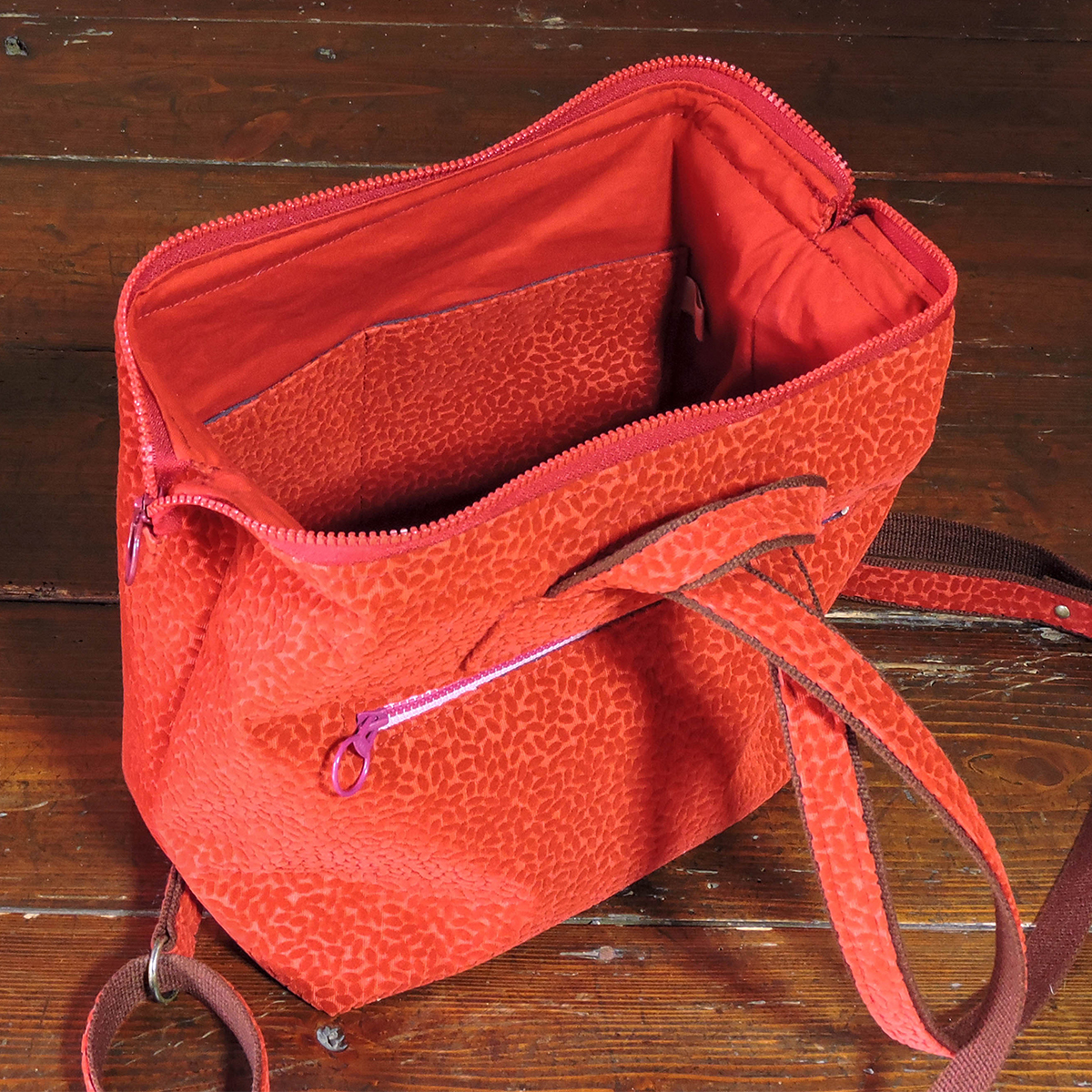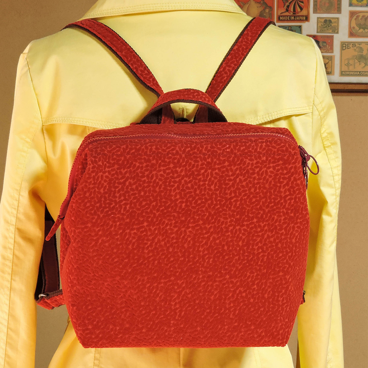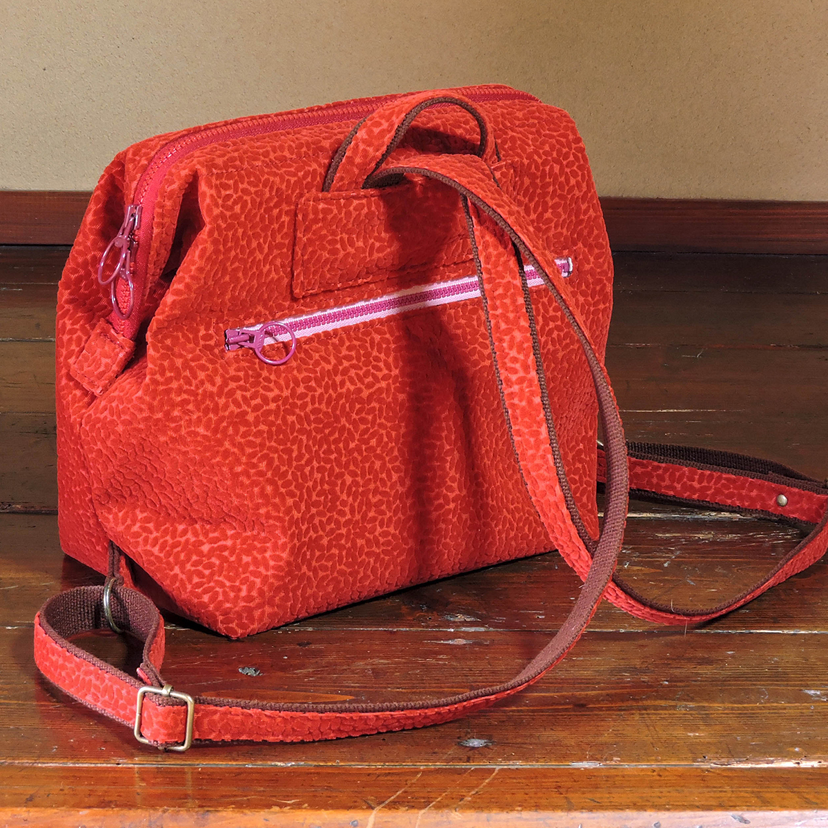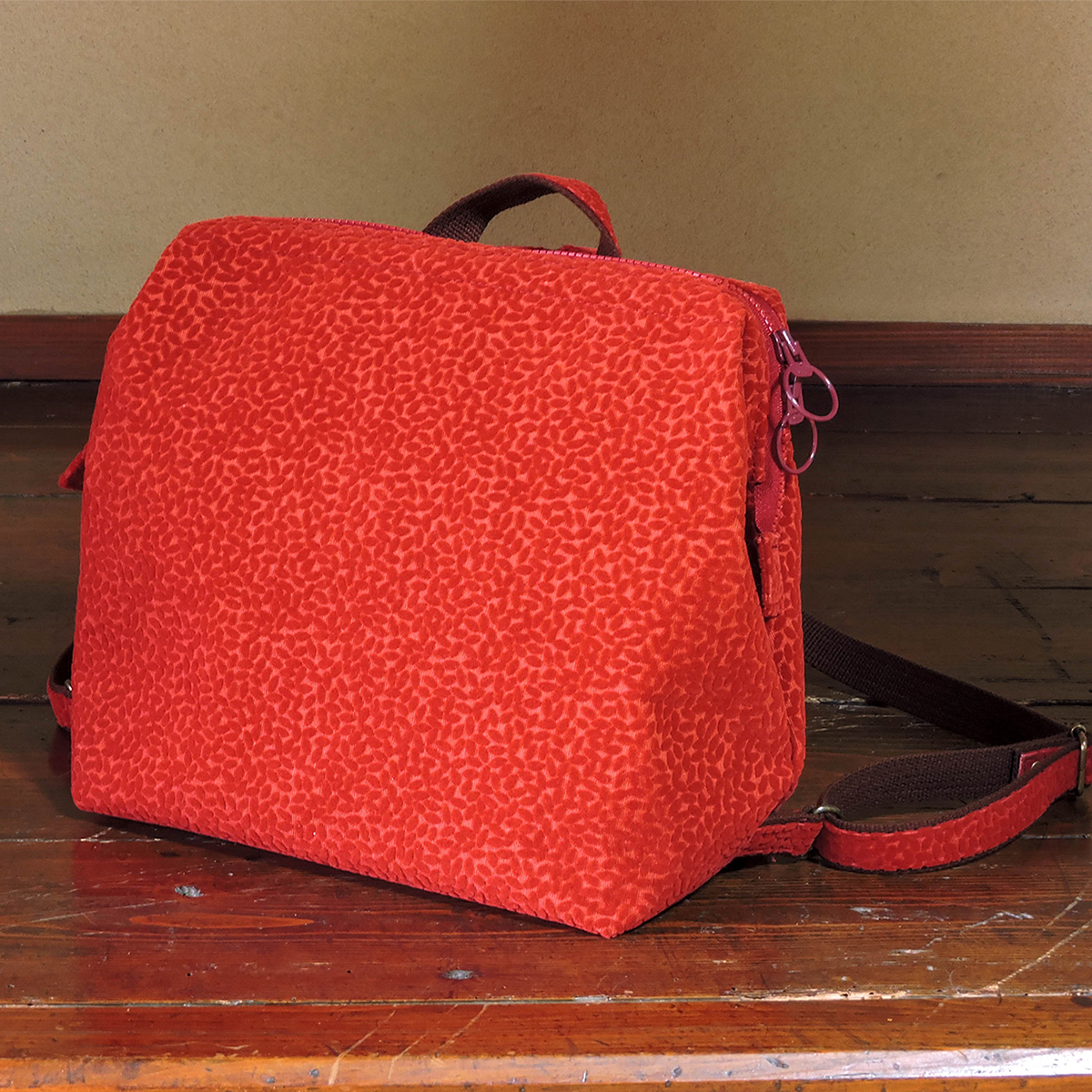 表地はフランスの生地屋さんで一目惚れした、真っ赤な生地を使って作りました。フロッキー加工によるベルベット調の手触りの良さと、細かくランダムに散りばめられた柄は、単色の赤に独特のニュアンスを醸し出しています。小ぶりですが、マチもたっぷりしていて、B5サイズのノートを横に入れる事が可能です。軽くてハリのある表地に裏地付きですので、型崩れがしにくく、長く愛用できます。肩紐は茶色のアクリルテープのベースに本体生地をのせて作っています。ちらりと見える茶色がアクセントに。長さも調節可能です。 ワイヤー口金入りですので、カパッと大きく開いて出し入れがしやすい形状です。メインの開口部はダブルファスナーにして使いやすくしています。