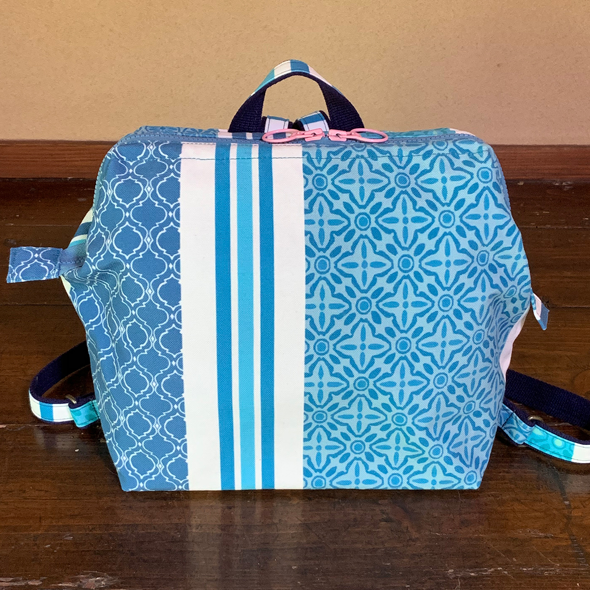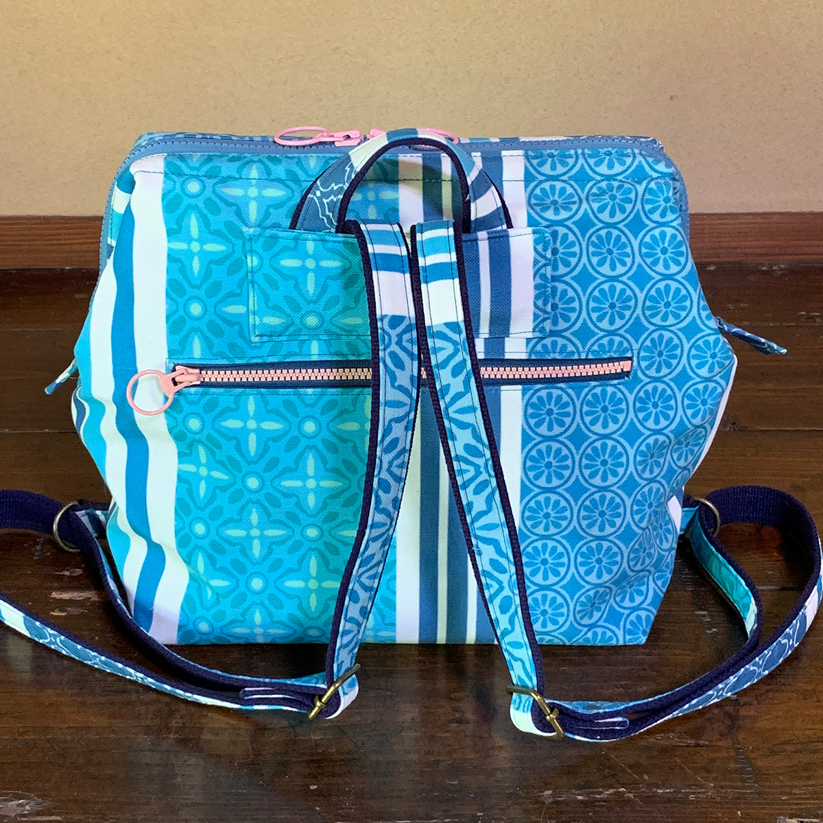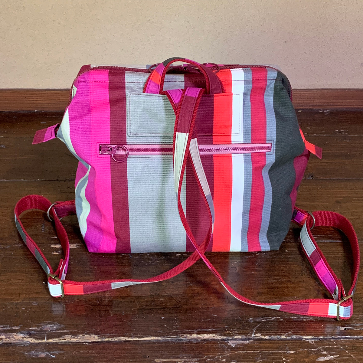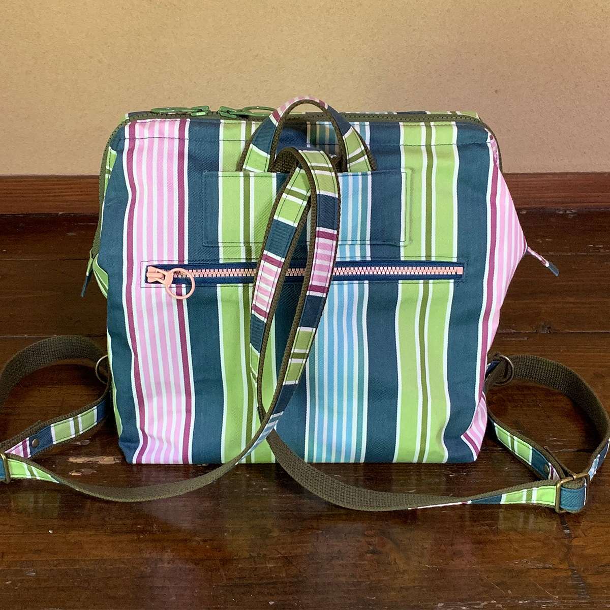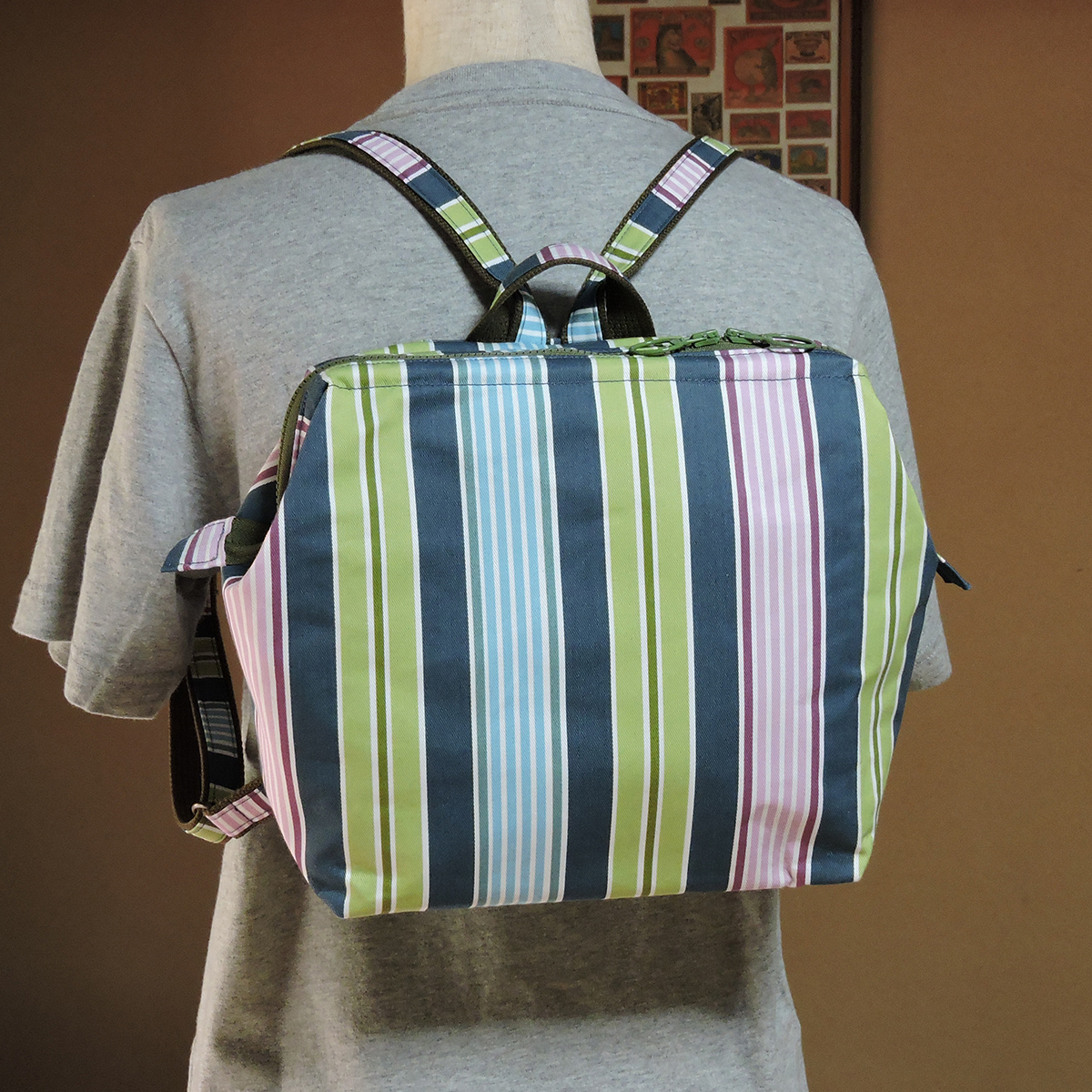 コロンとしたカタチが可愛い、ワイヤー口金入りのミニリュックです。小ぶりですが、マチもたっぷりしていて、B5サイズのノートを横に入れる事が可能です。ワイヤー口金入りですので、カパッと大きく開いて出し入れがしやすい形状です。メインの開口部はダブルファスナーにして使いやすくしています。表背面にファスナーポケット。内側にはファスナーポケットと貼りポケットを付けています。バッグ背面のファスナーポケットは、メインを開けなくても鍵やパスケースなど小物を出し入れできるので便利です。
