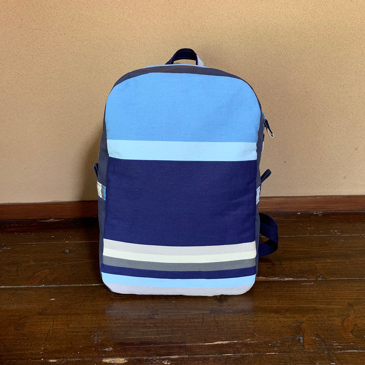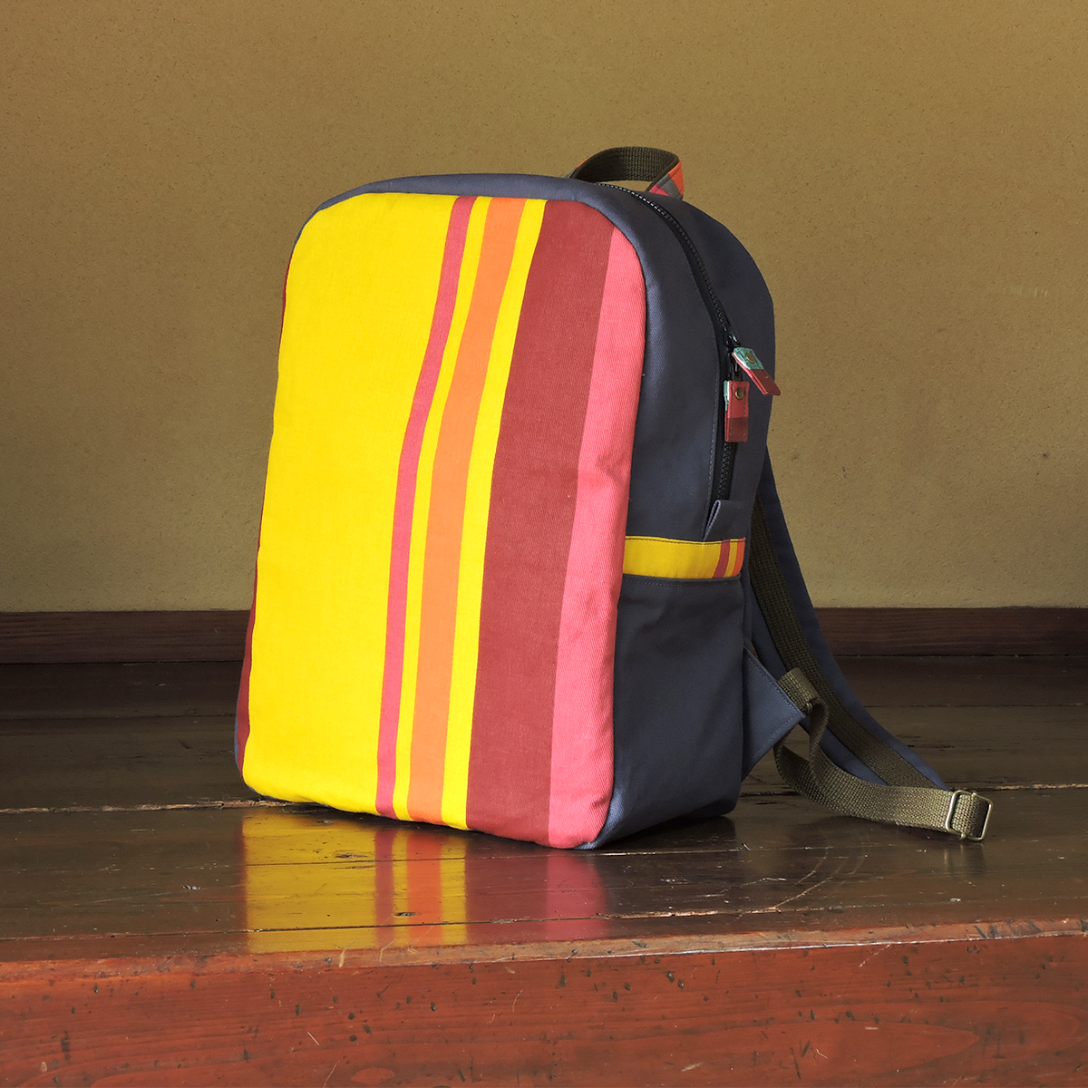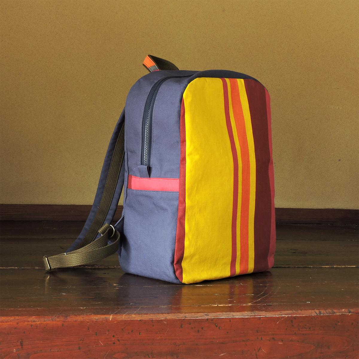 ビビッドなストライプのフランス製生地に、ネイビーのキャンバス無地を合わせてみました。鮮やかな色使いにスッキリとしたデザインは、男女問わずに使えるユニセックスモデル。A4サイズがタテに入ります。マチ幅もたっぷりで大容量。メインはダブルファスナー。表背面に便利なファスナーポケット付。内側にファスナーポケット+貼りポケット付きです。