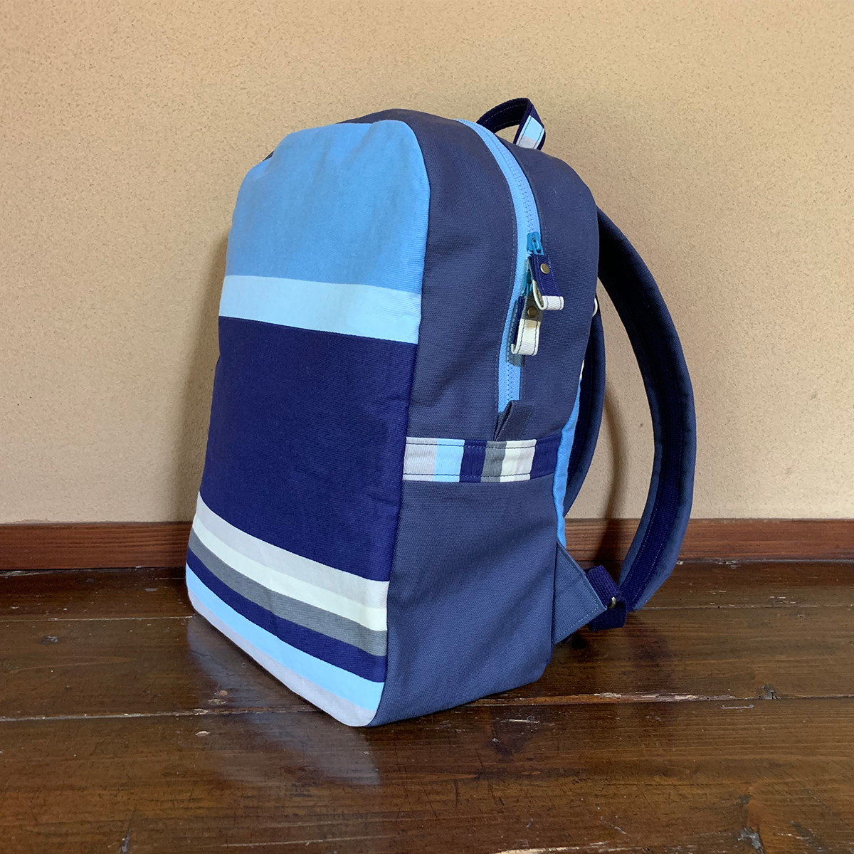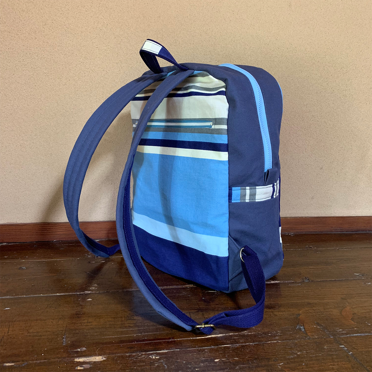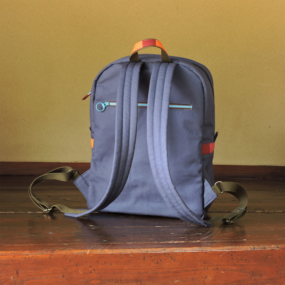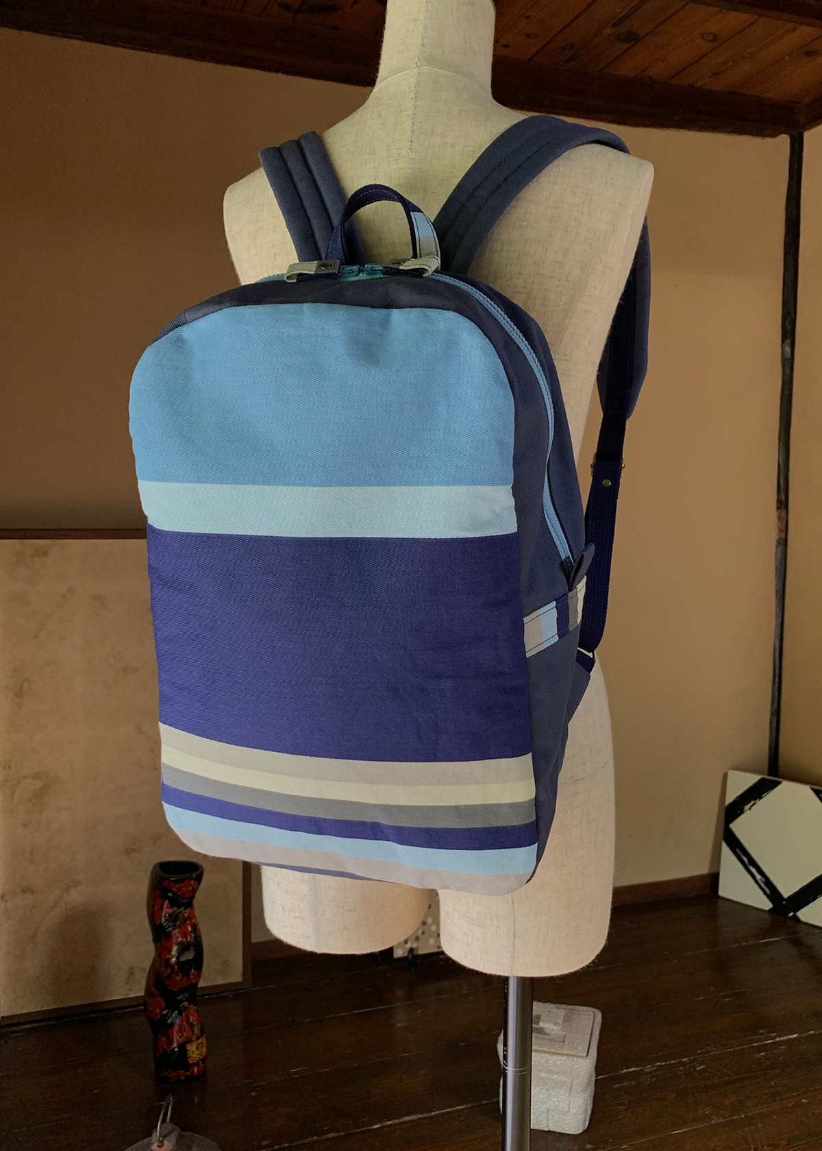ビビッドなストライプのフランス製生地に、ネイビーのキャンバス無地を合わせてみました。鮮やかな色使いにスッキリとしたデザインは、男女問わずに使えるユニセックスモデル。A4サイズがタテに入ります。マチ幅もたっぷりで大容量。メインはダブルファスナー。表背面に便利なファスナーポケット付。内側にファスナーポケット+貼りポケット付きです。