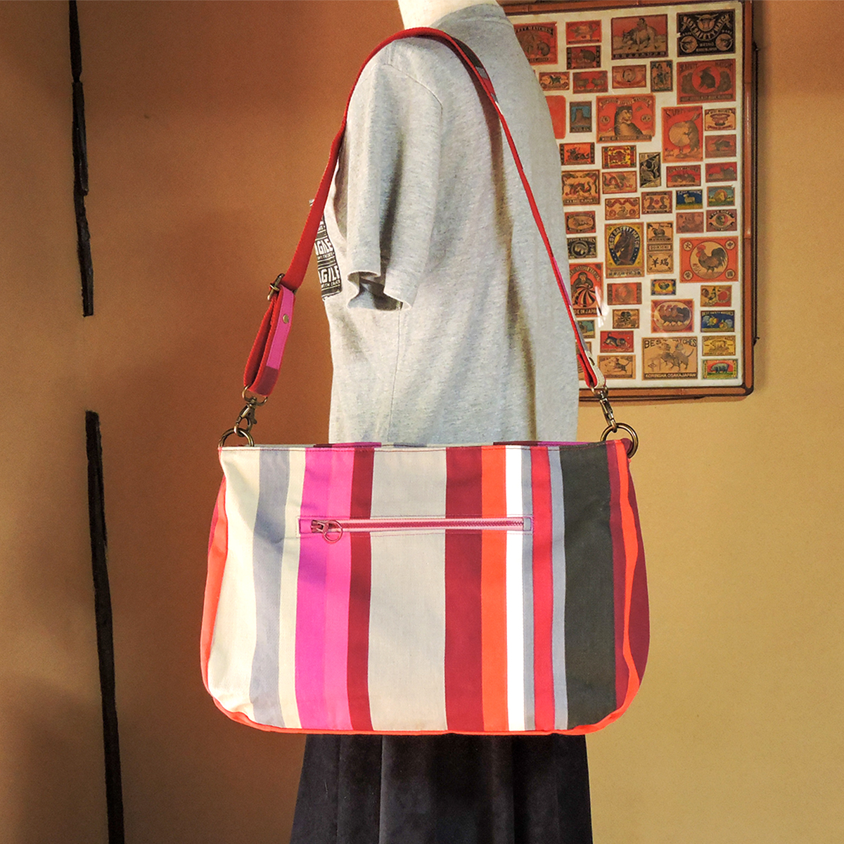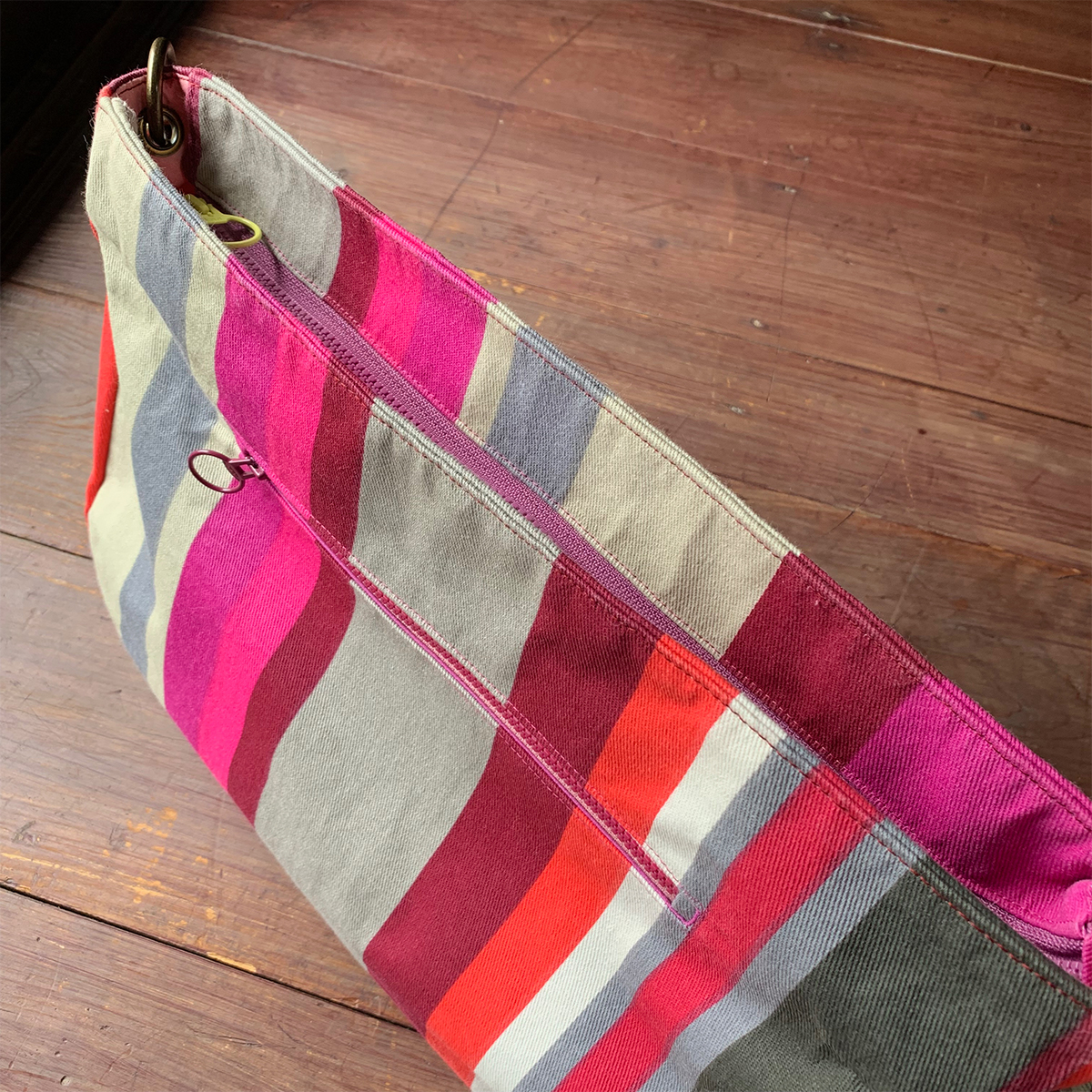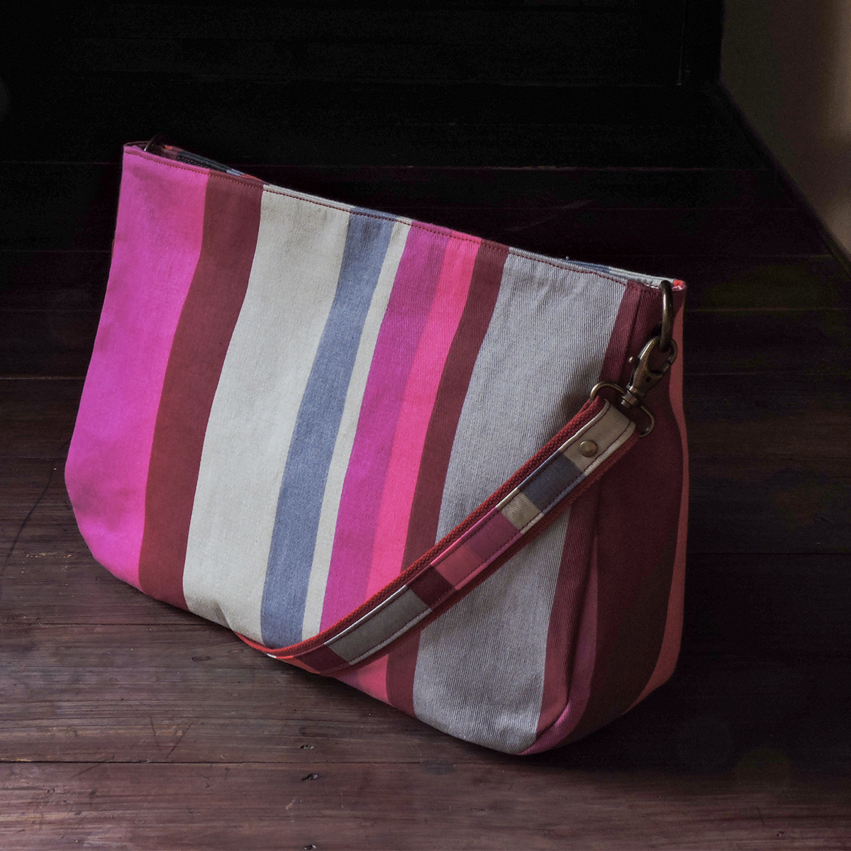 マルチピンクのストライプ。たっぷり収納ショルダーバッグ