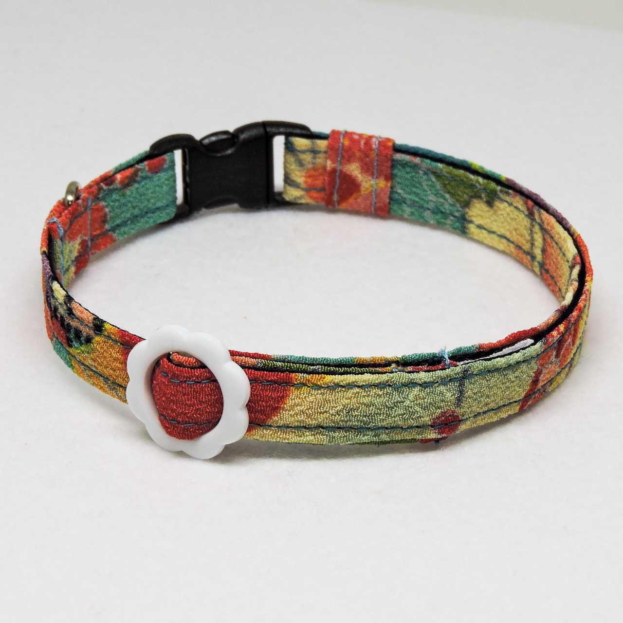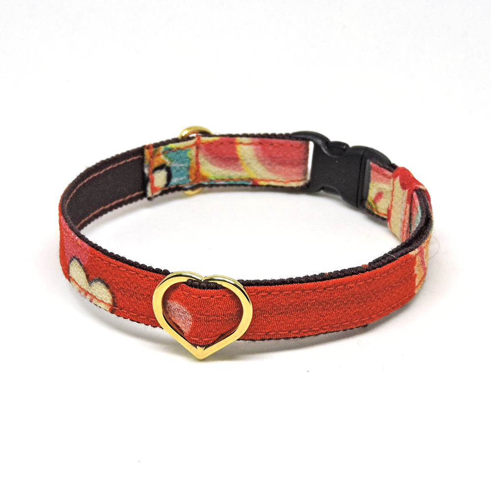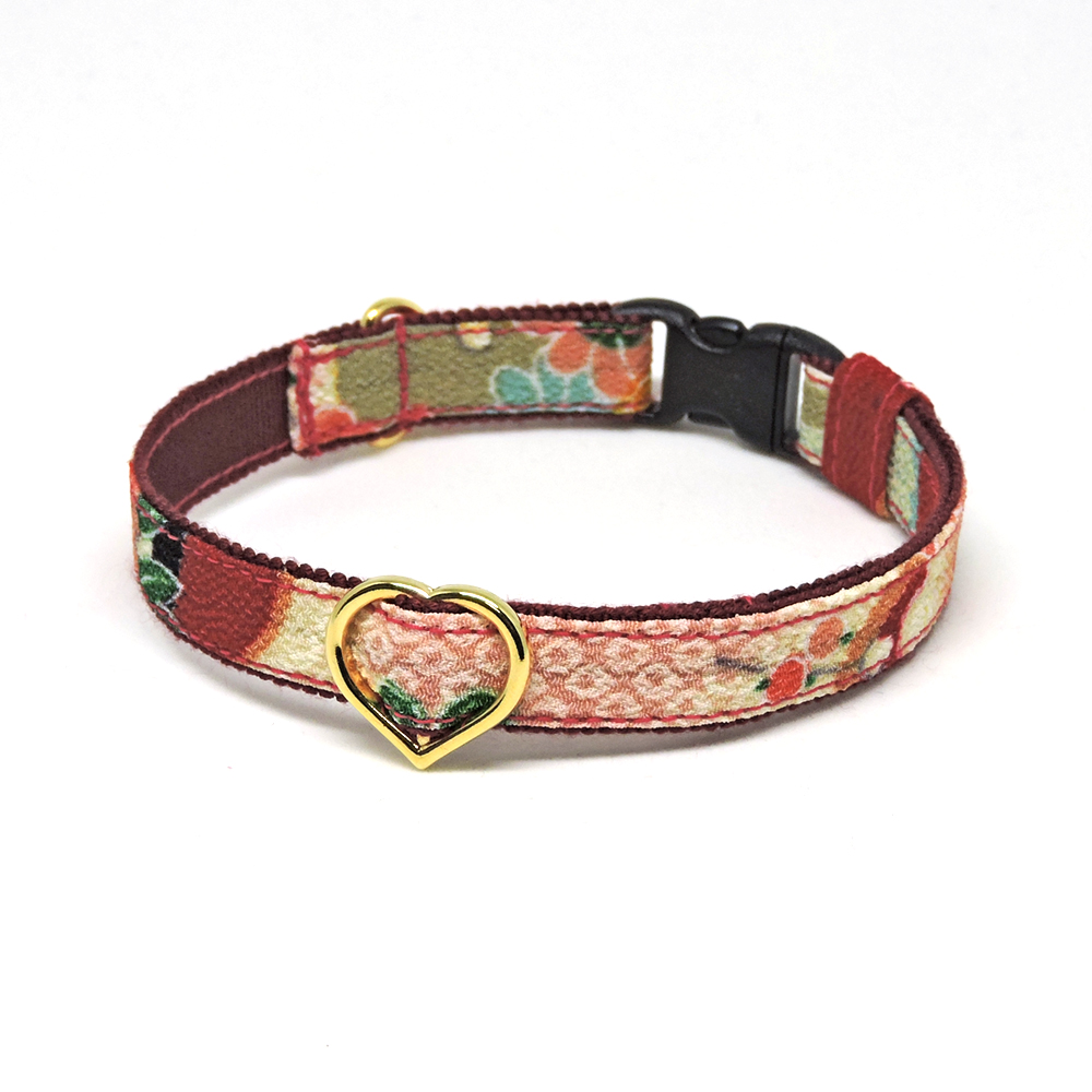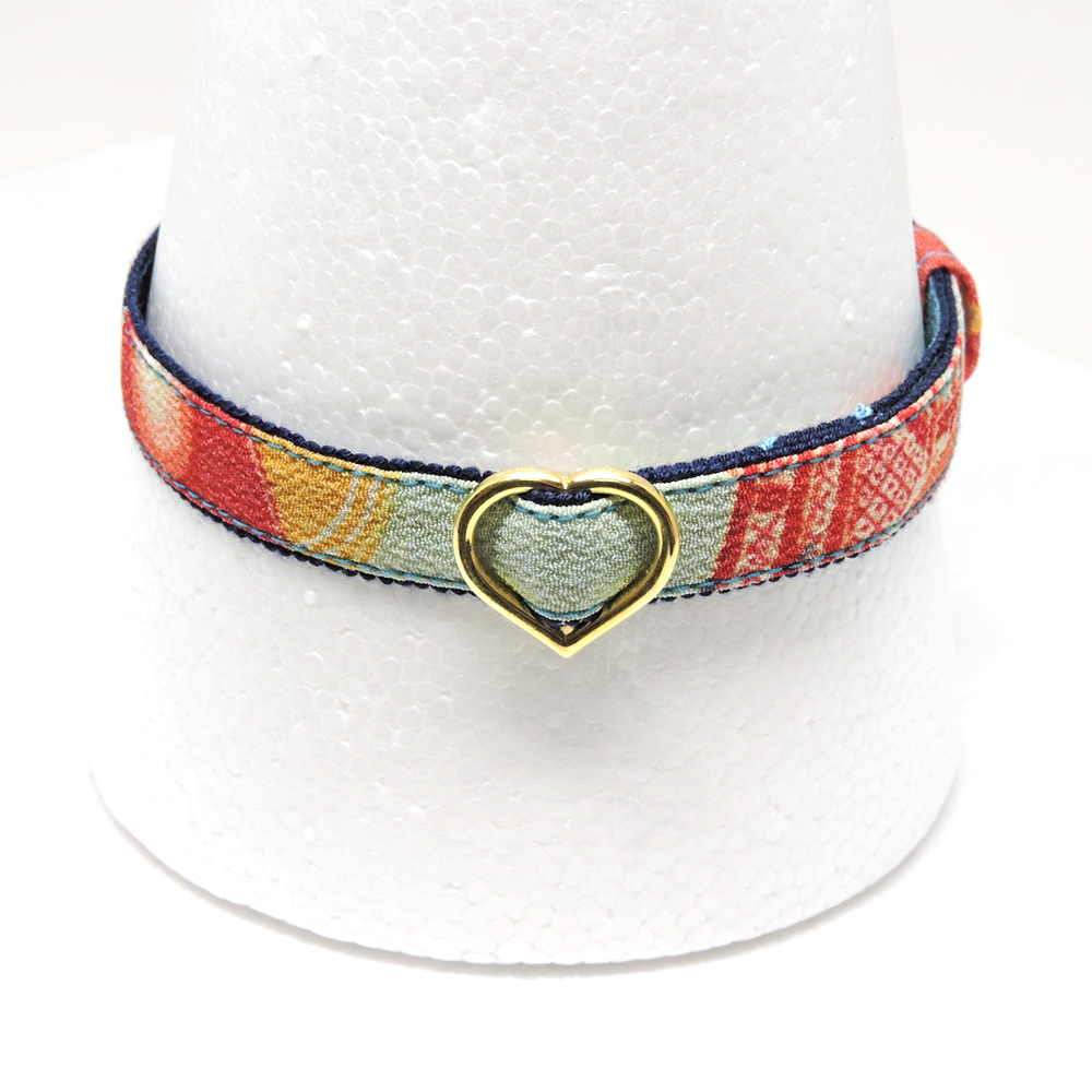 一越ちりめんを使った、猫用首輪です。表のちりめんの色柄にあわせて、内側のテープやステッチの色を変えています。ちりめんは樹脂コーティングされてますので汚れにくく、軽くて丈夫で、猫ちゃんへの負担が少ない首輪です。