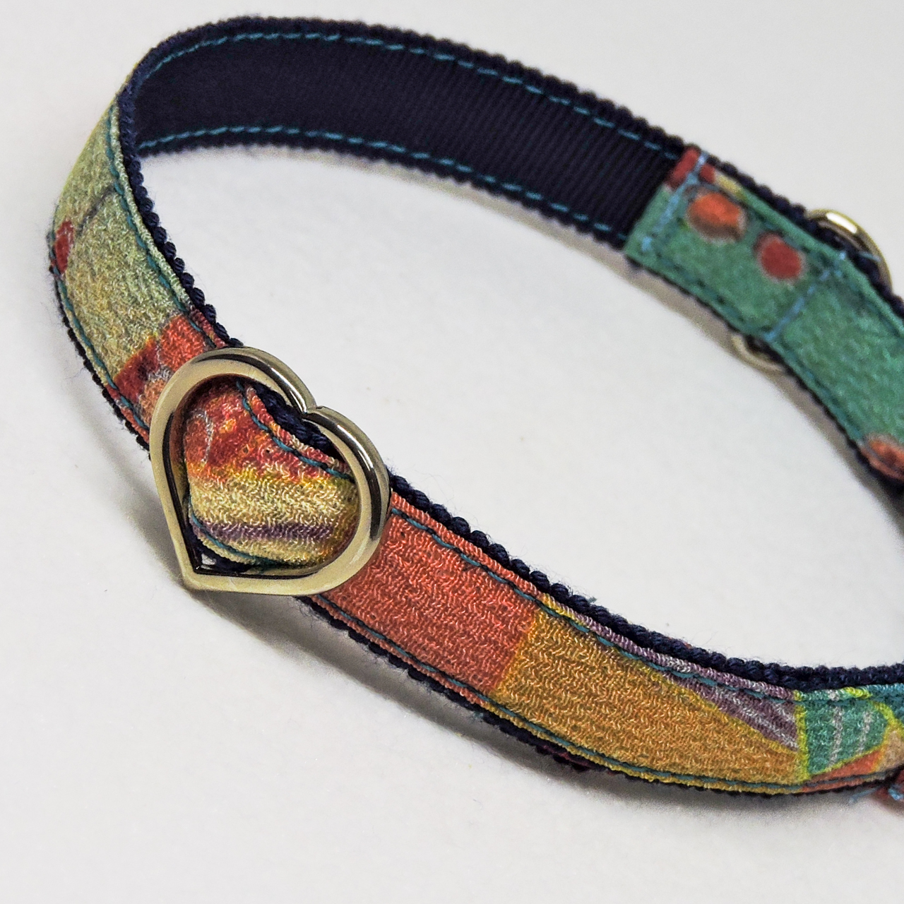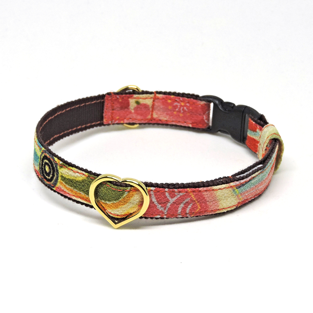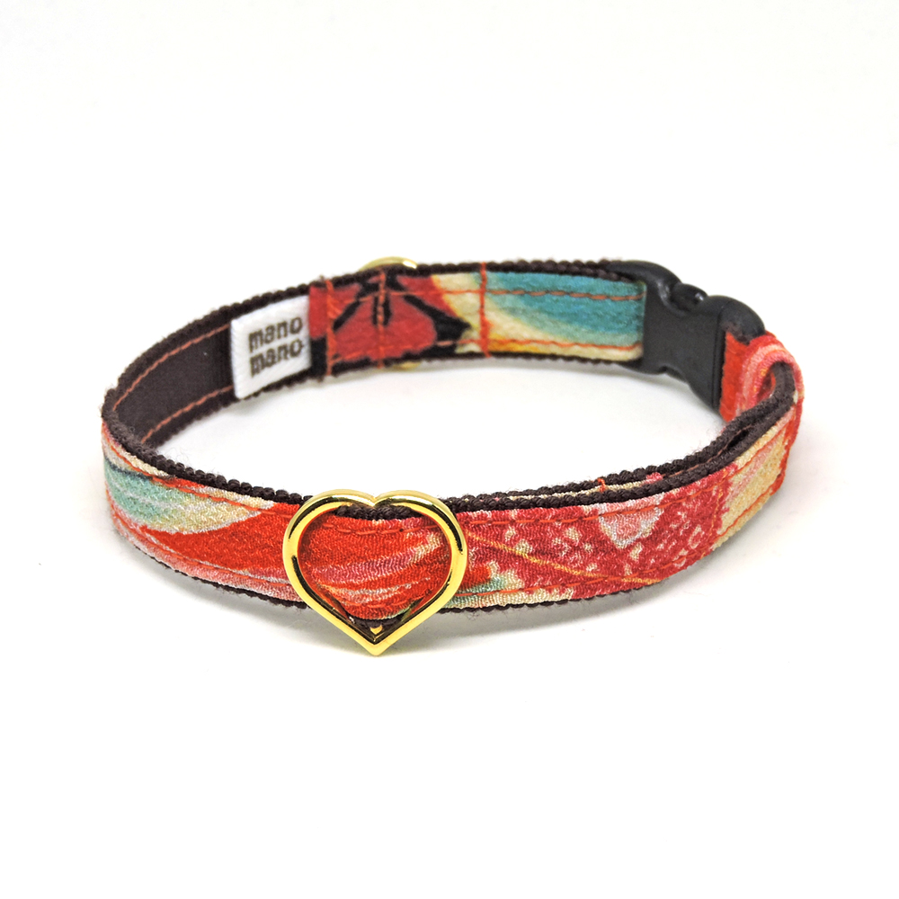 一越ちりめんを使った、猫用首輪です。表のちりめんの色柄にあわせて、内側のテープやステッチの色を変えています。ちりめんは樹脂コーティングされてますので汚れにくく、軽くて丈夫で、猫ちゃんへの負担が少ない首輪です。