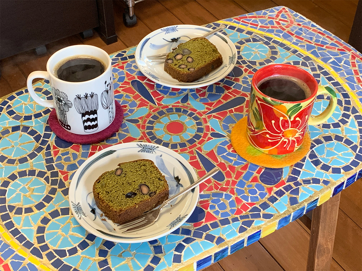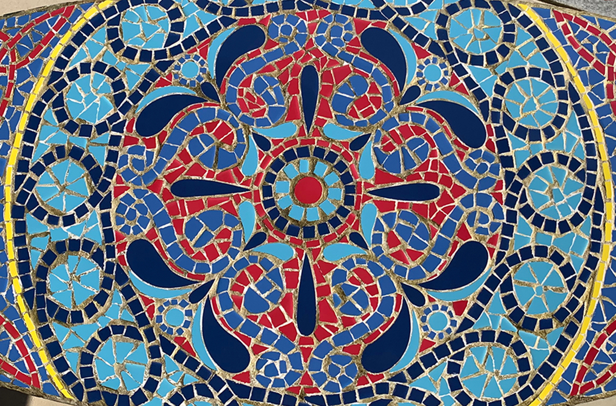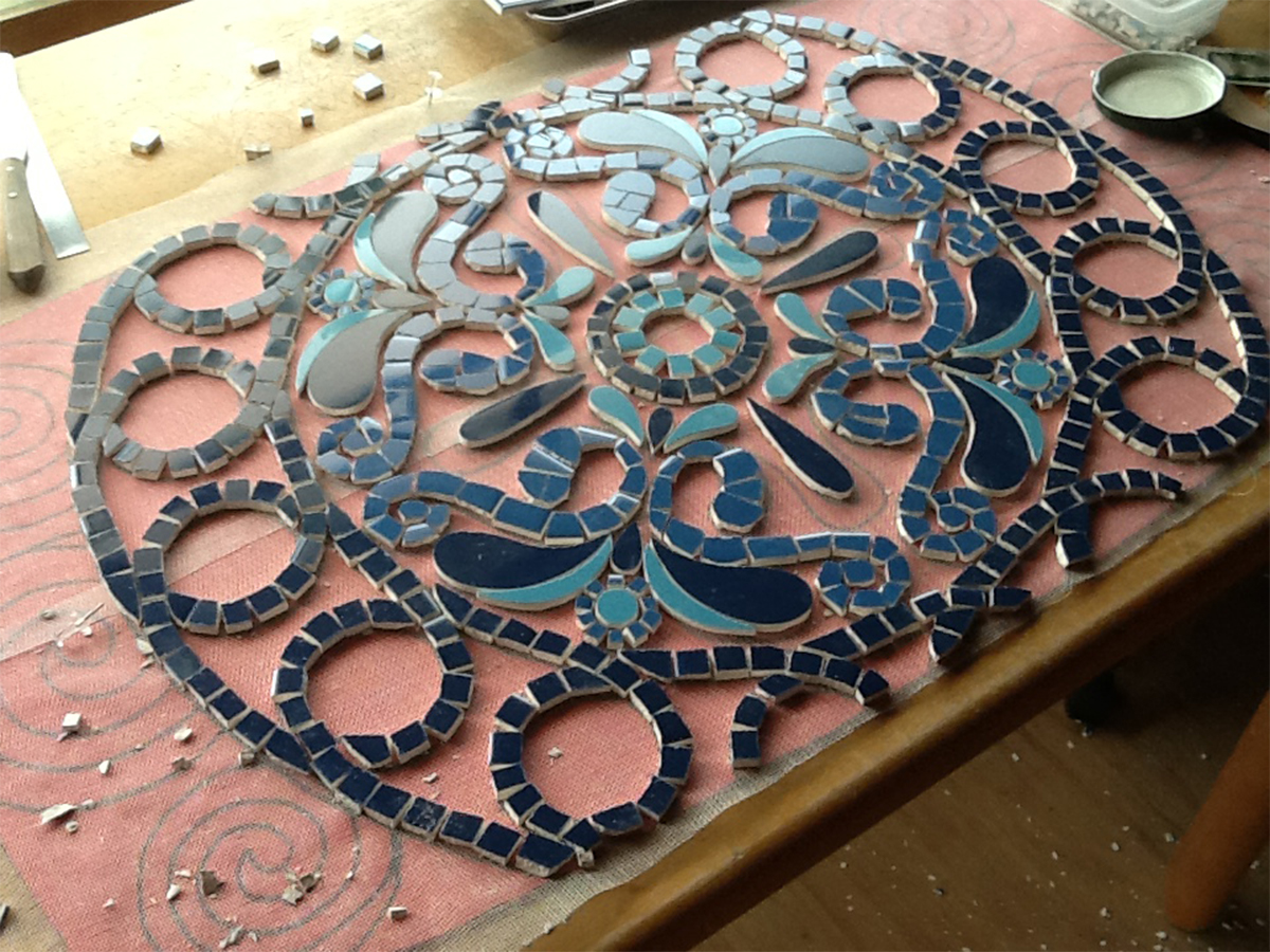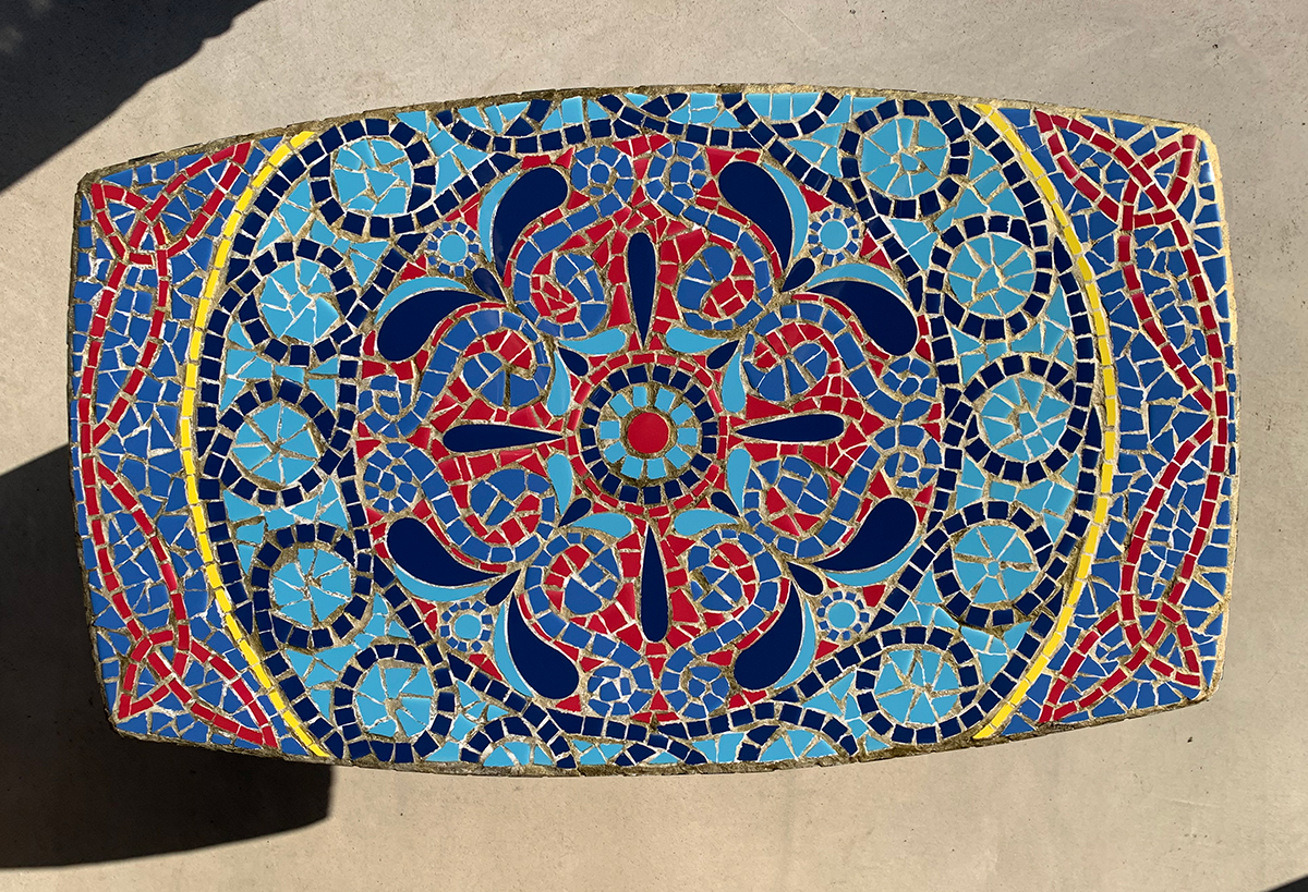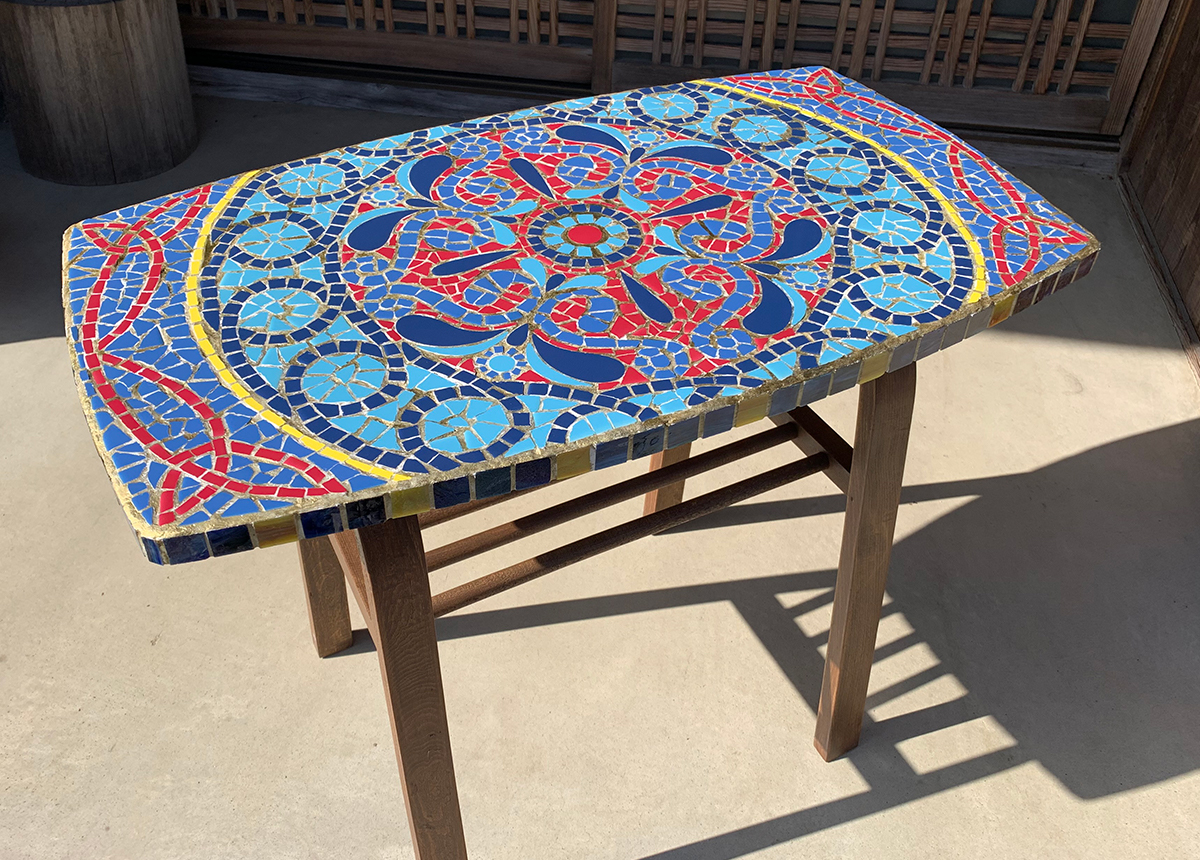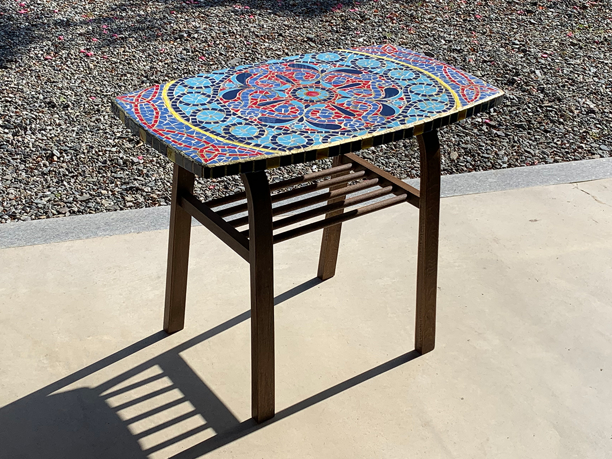 アンティークな木製サイドテーブルの天面にタイルモザイクを施しました。ケルトの伝統模様をモチーフにしています。